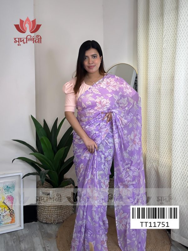 এই জর্জেট শাড়িটি নরম ও হালকা ফেব্রিকের তৈরি। সফট কালার টোন ও মিনিমাল ফিনিশিং শাড়িটিকে করেছে আধুনিক ও রুচিশীল, যা সহজেই যেকোনো বয়সের নারীর স্টাইলে মানানসই। হালকা ওজনের কারণে সারাদিন পরলেও অস্বস্তি হয় না এবং গরম আবহাওয়াতেও এটি খুবই আরামদায়ক।